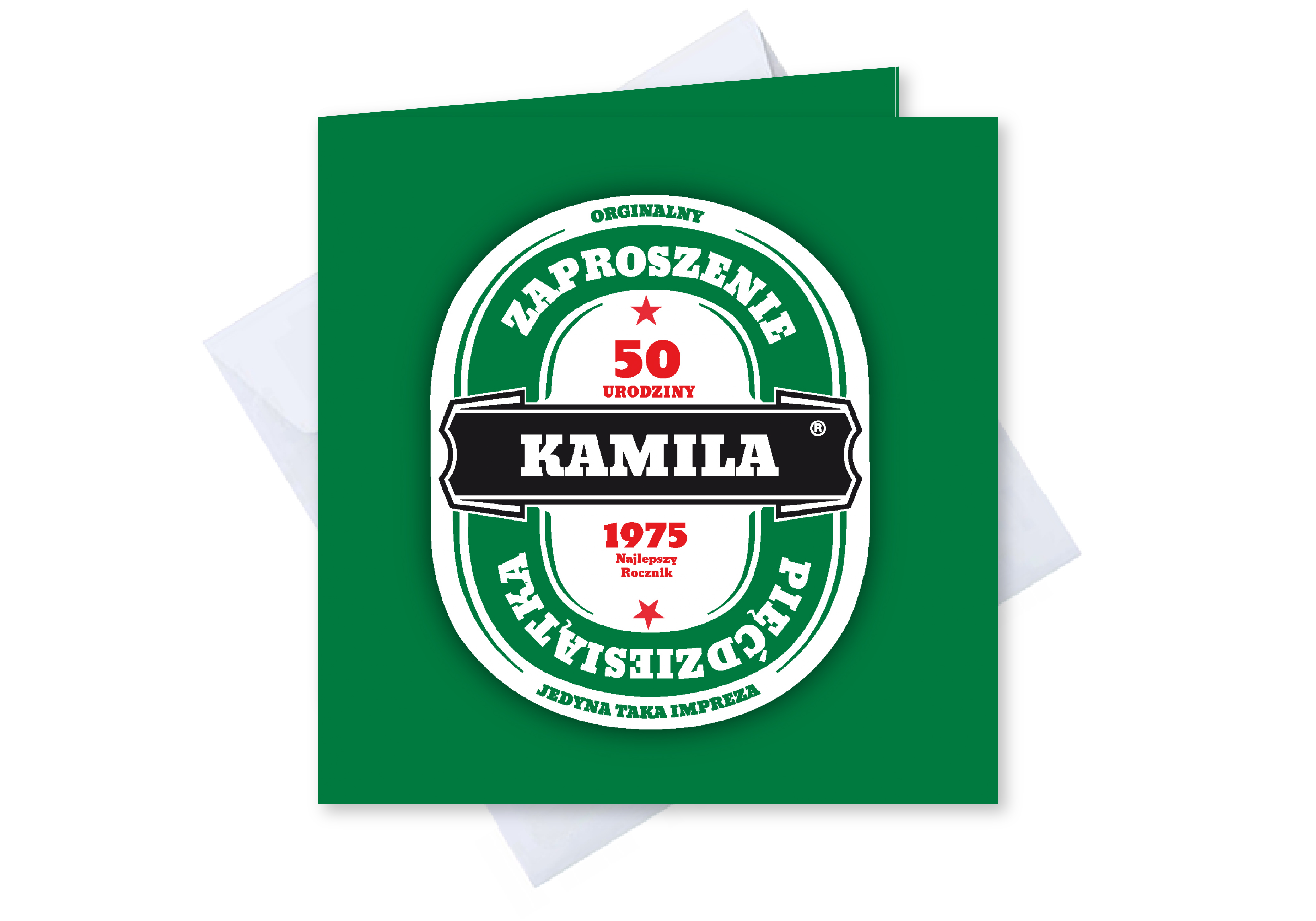 ZAPROSZENIE NA 50 URODZINY PERSONALIZOWANE + KOPERTA piwo jak heineken