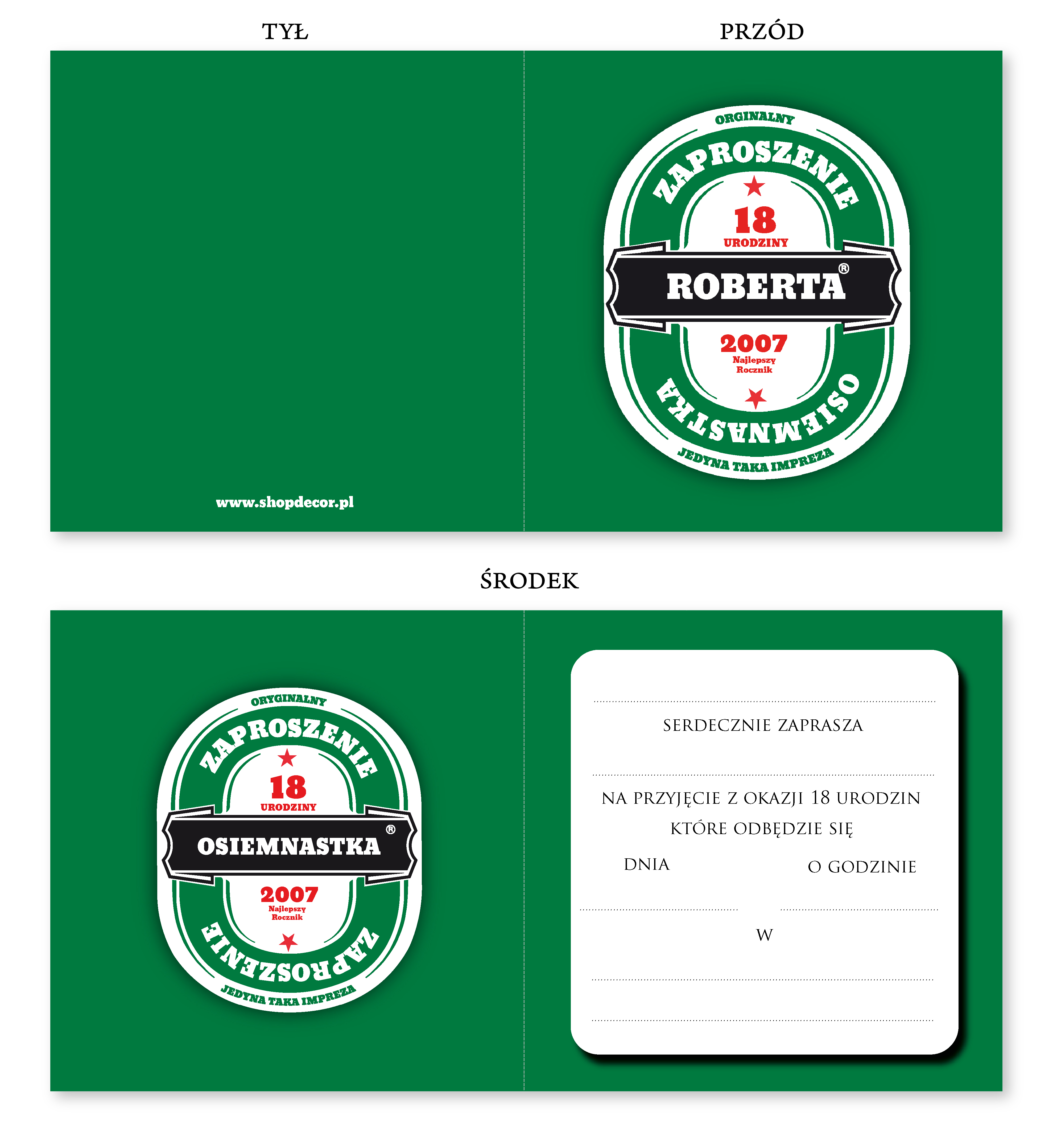 ZAPROSZENIE NA 18 URODZINY PERSONALIZOWANE + KOPERTA piwo jak heinekenZAPROSZENIE NA 18 URODZINY PERSONALIZOWANE + KOPERTA piwo jak heineken