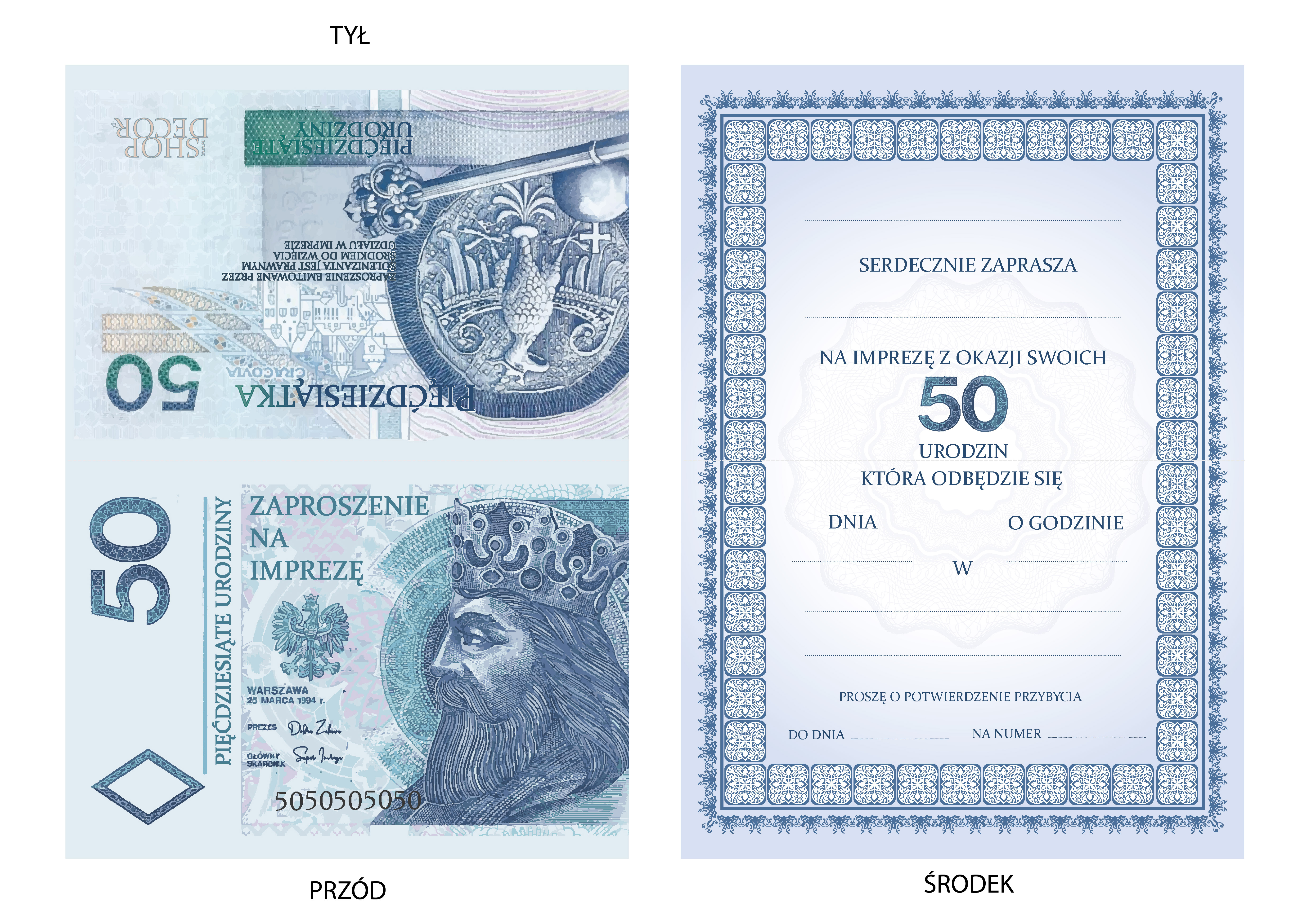 ZAPROSZENIE NA 50 URODZINY NOWE 50 ZŁOTYCH BANKNOT + KOPERTA