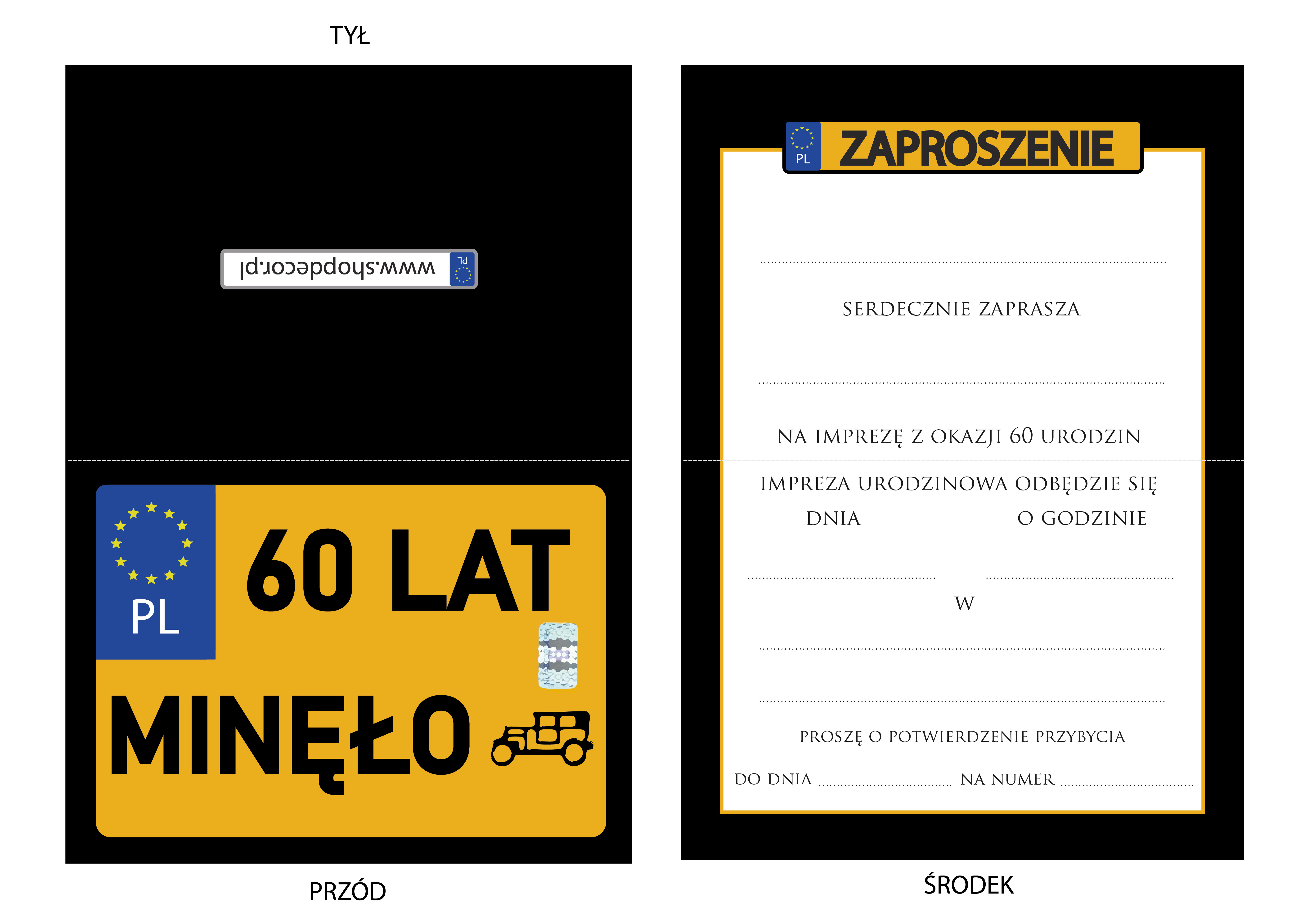 ZAPROSZENIE NA 60 URODZINY STARA TABLICA REJESTRACYJA ZABYTEK ŻÓŁTA TABLICA