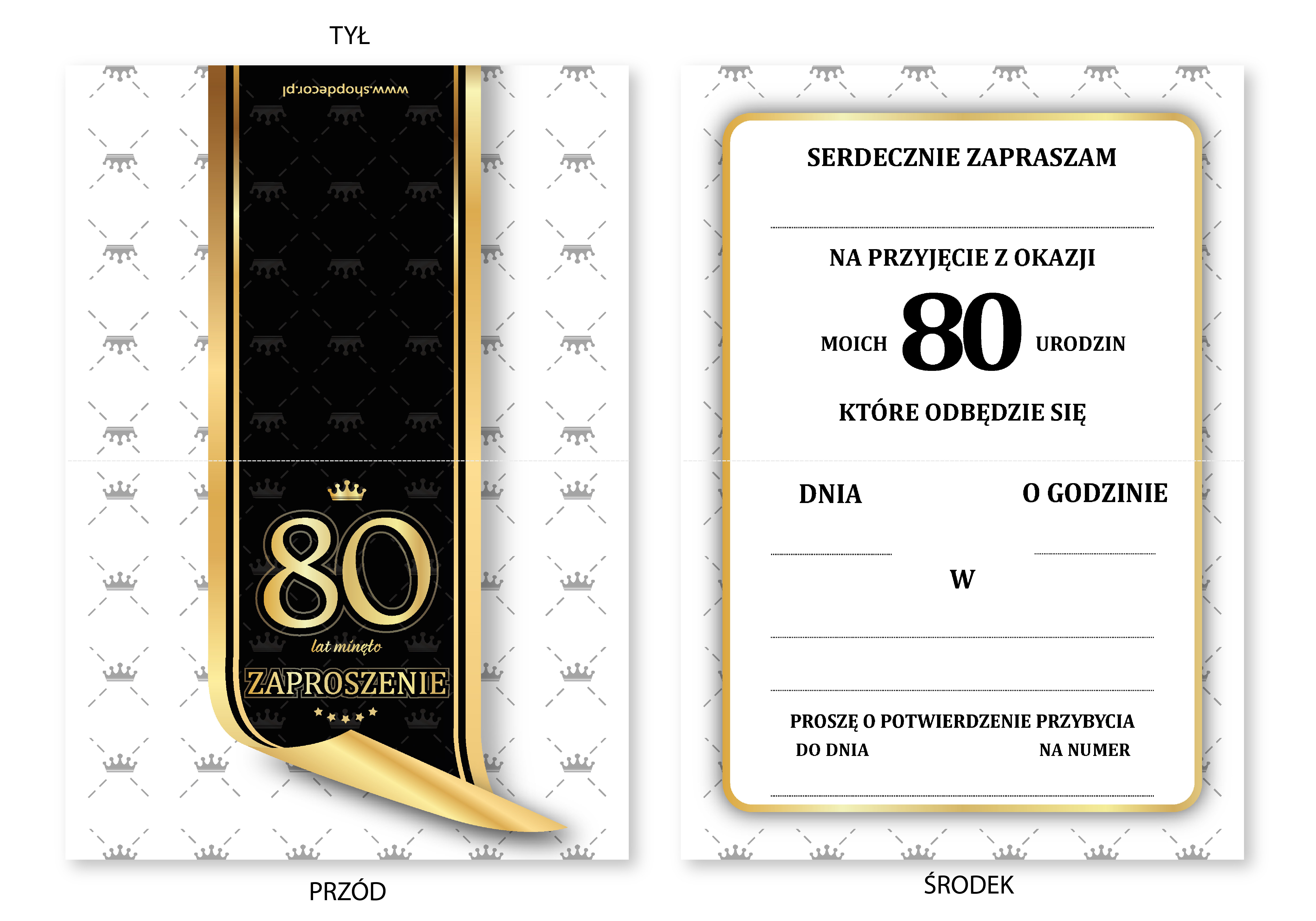 ZAPROSZENIE NA 80 URODZINY BIAŁE CZARNE ZŁOTE ELEGANCKIE LUX + KOPERTA