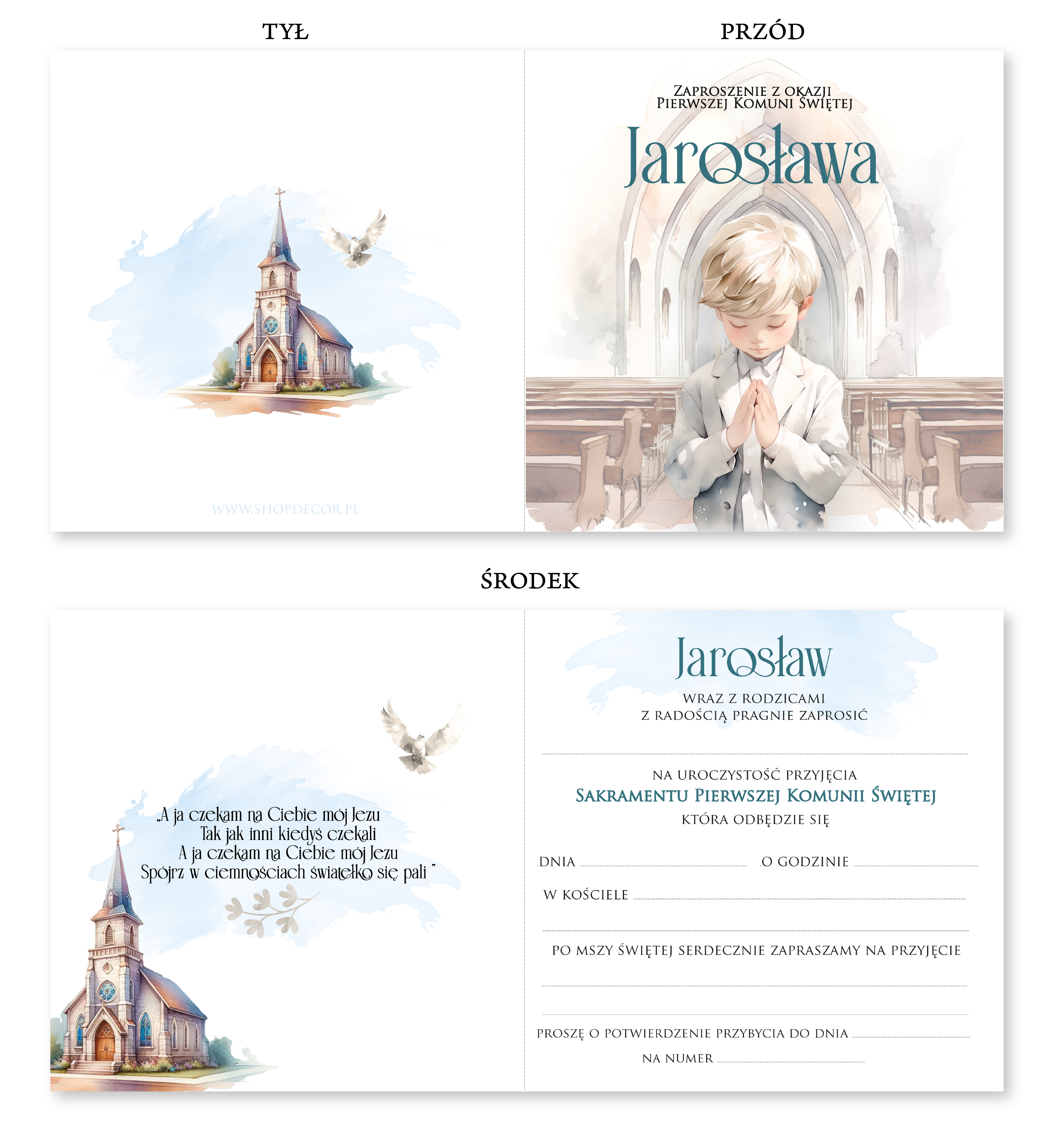 ZAPROSZENIE NA PIERWSZĄ KOMUNIĘ KOMUNIJNE + IMIĘ + KOPERTA dla chłopca