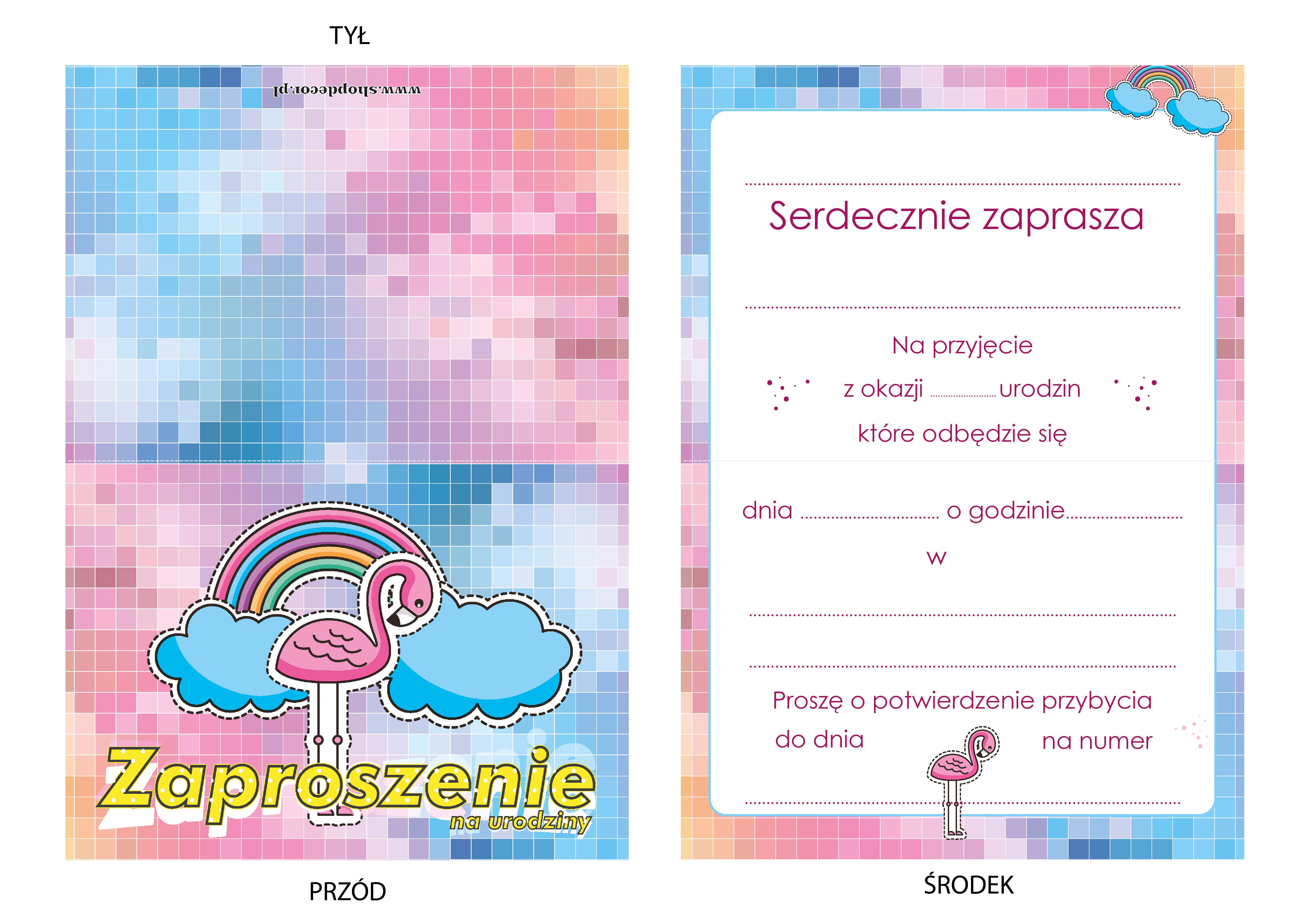 ZAPROSZENIE NA URODZINY FLAMING KOLOROWY TĘCZA FLAMINGI URODZINOWE + KOPERTA