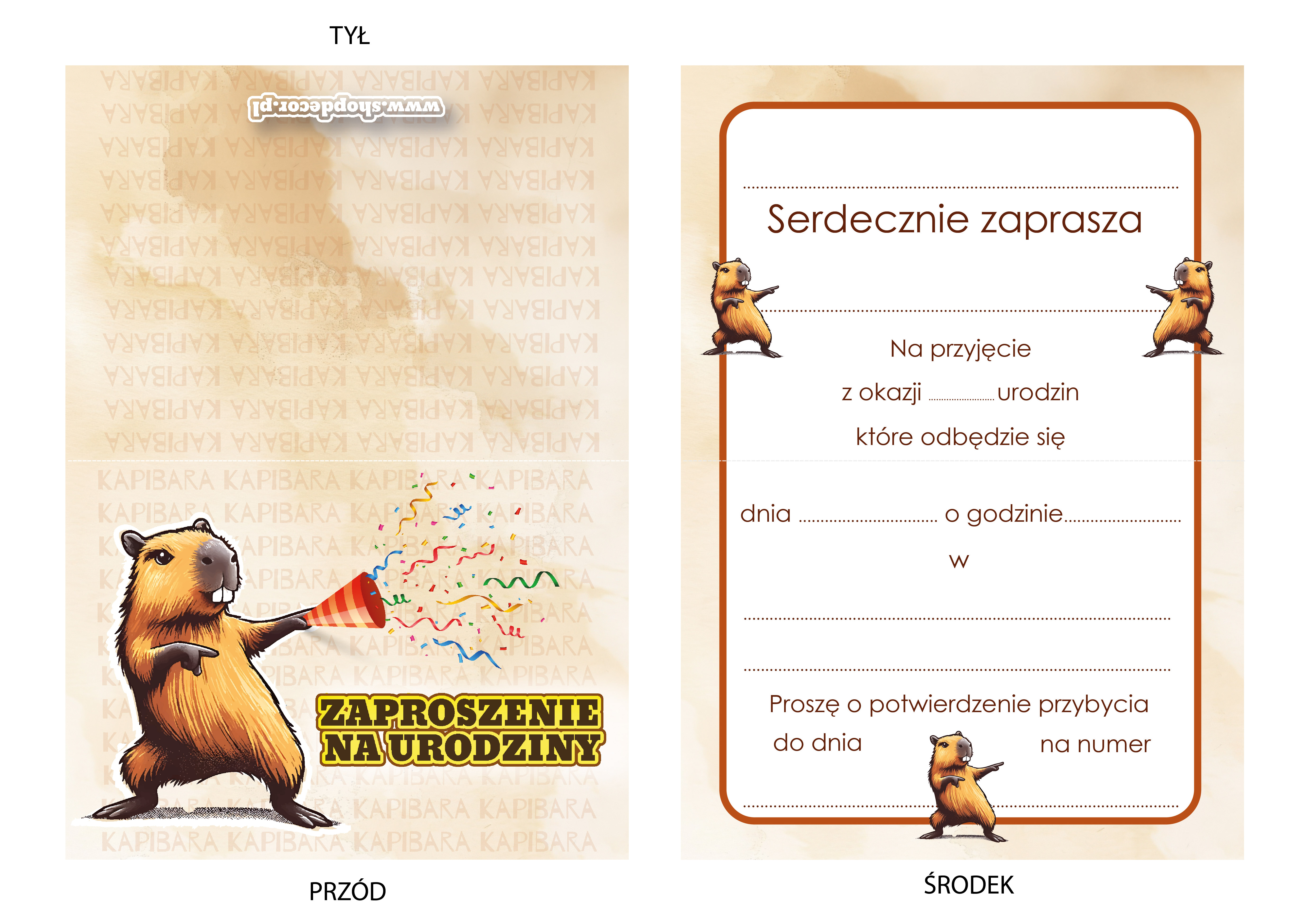 Strona główna » Zaproszenia » Urodziny dzieci » ZAPROSZENIE NA URODZINY KAPIBARA + KOPERTA zwierzę urodzinowe