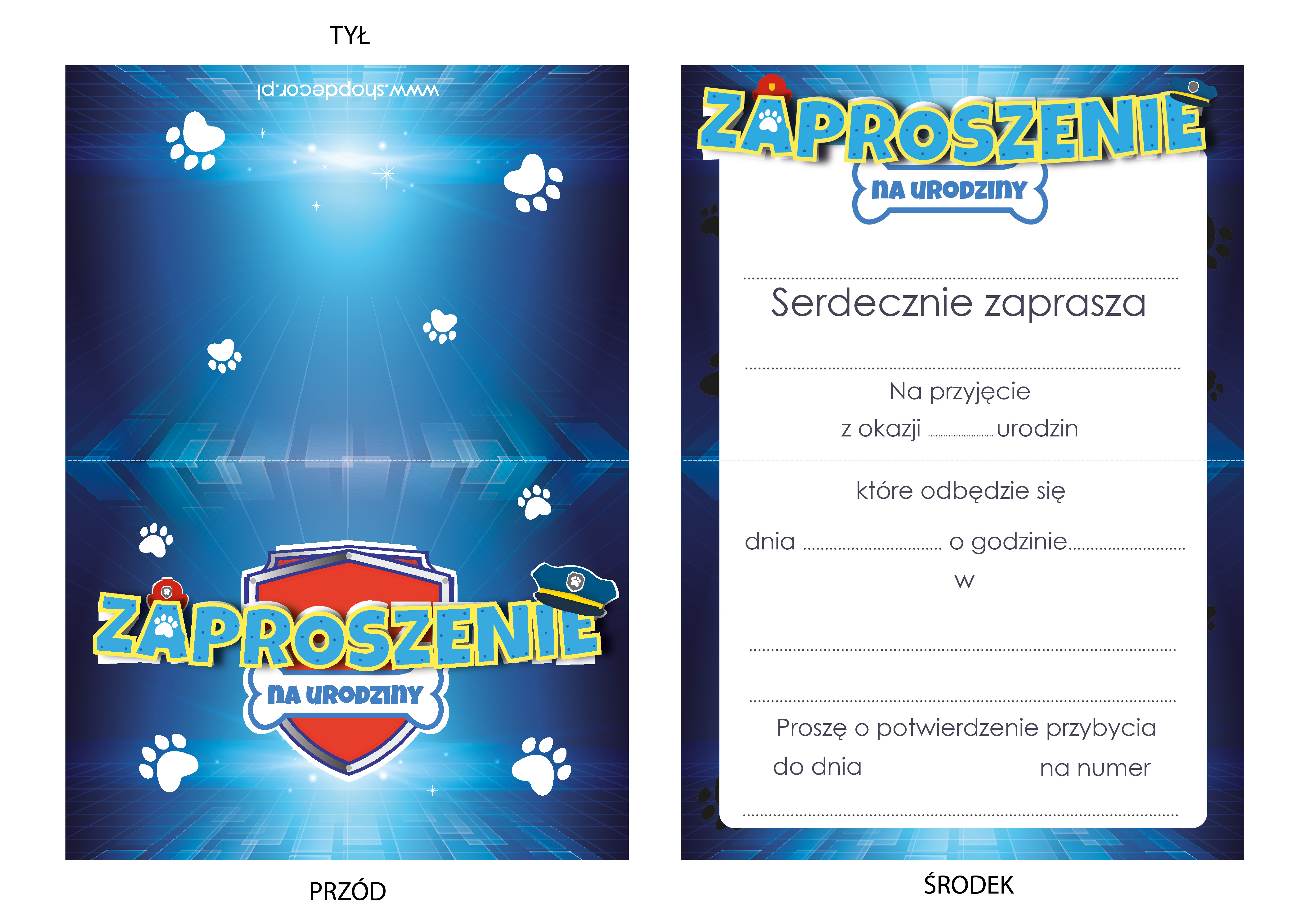 ZAPROSZENIE NA URODZINY PSI PATROL PAW PATROL CHASE MARSHALL + KOPERTA